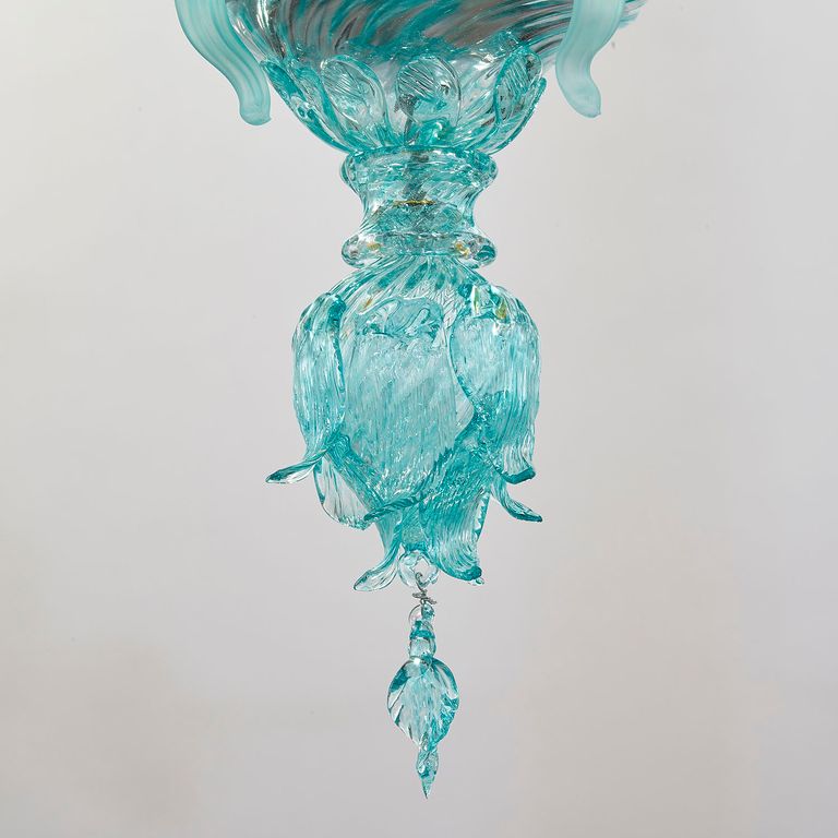 Elegante Verarbeitung in farbiger Glaspaste, bereichert durch einen Triumph kostbarer Glasdetails wie Blumen und Blätter, die von venezianischen Glasmeistern ausschließlich in Handarbeit gefertigt wurden.