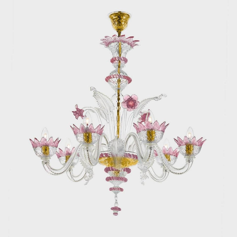 Work of art embellished with precious leaves and flowers produced by Venetian master glassmakers.