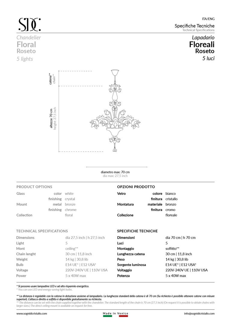 De elegante elaboración, embellecida por un triunfo de preciosos detalles de vidrio y flores de pasta de vidrio, fabricados enteramente a a mano por nuestros maestros muraneses.