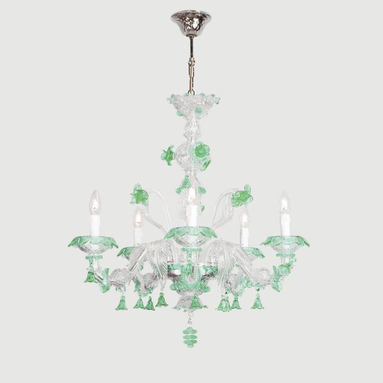 Travail artistique agrémenté de précieux anneaux, feuilles et fleurs travaillés par des maîtres verriers vénitiens.
