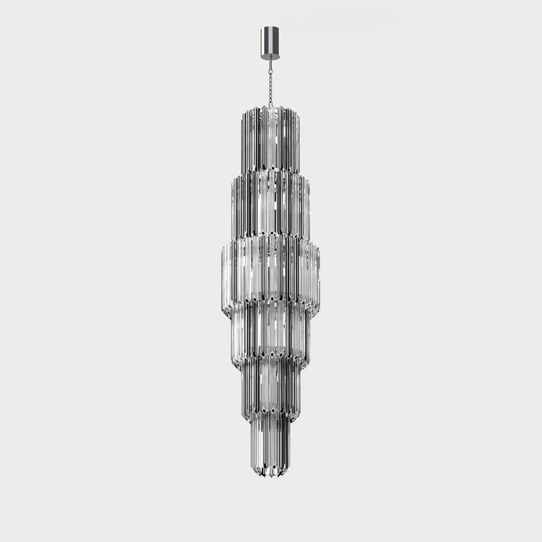 Il design originale gioca sulla ripetizione di elementi vitrei scintillanti (detti 'quadriedri') in grado di creare un'illuminazione raffinata e affascinante.