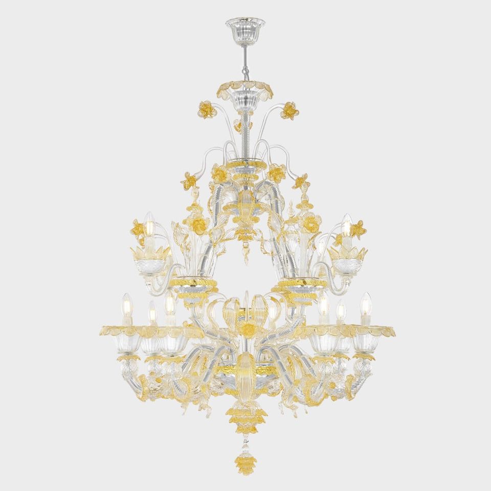 Ca' Rezzonico Augusto: autentico lampadario di lusso veneziano lavorato con la tecnica del vetro di Murano. Questo modello, che adorna le sale dei più eleganti dei palazzi veneziani, è un'opera d'arte caratterizzata da un trionfo di preziosi particolari in vetro, quali fiori foglie e pendagli, lavorati esclusivamente a mano dai maestri muranesi.