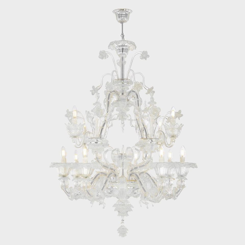 Ca' Rezzonico Augusto: autentico lampadario di lusso veneziano lavorato con la tecnica del vetro di Murano.  Questo modello, che adorna le sale dei più eleganti dei palazzi veneziani, è un'opera d'arte caratterizzata da un trionfo di preziosi particolari in vetro, quali fiori foglie e pendagli, lavorati esclusivamente a mano dai maestri muranesi.