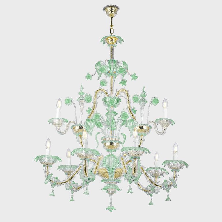 • Un'opera d'arte caratterizzata da un trionfo di preziosi particolari in vetro, quali fiori foglie e pendagli, lavorati esclusivamente a mano dai maestri muranesi.