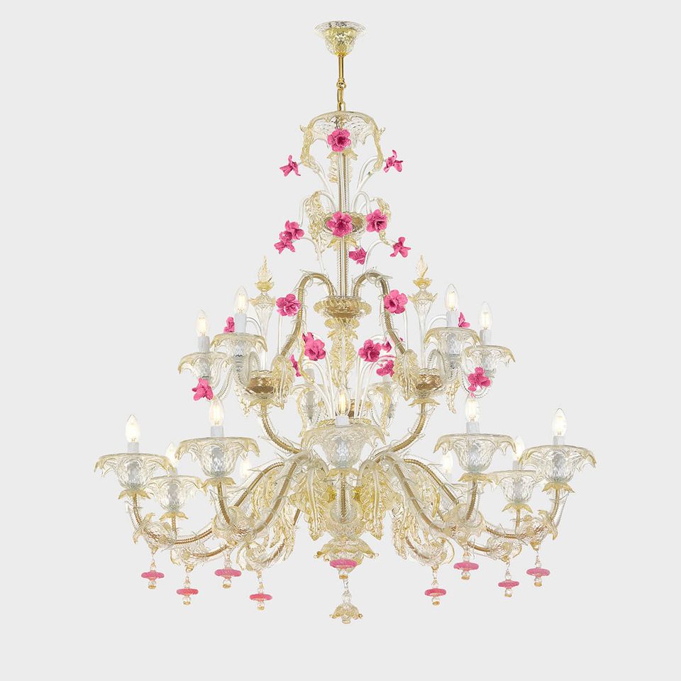 Elegante lavorazione in pasta vitreada un trionfo di preziosi particolari in vetro, quali fiori e foglie, lavorati esclusivamente a mano dai maestri muranesi.