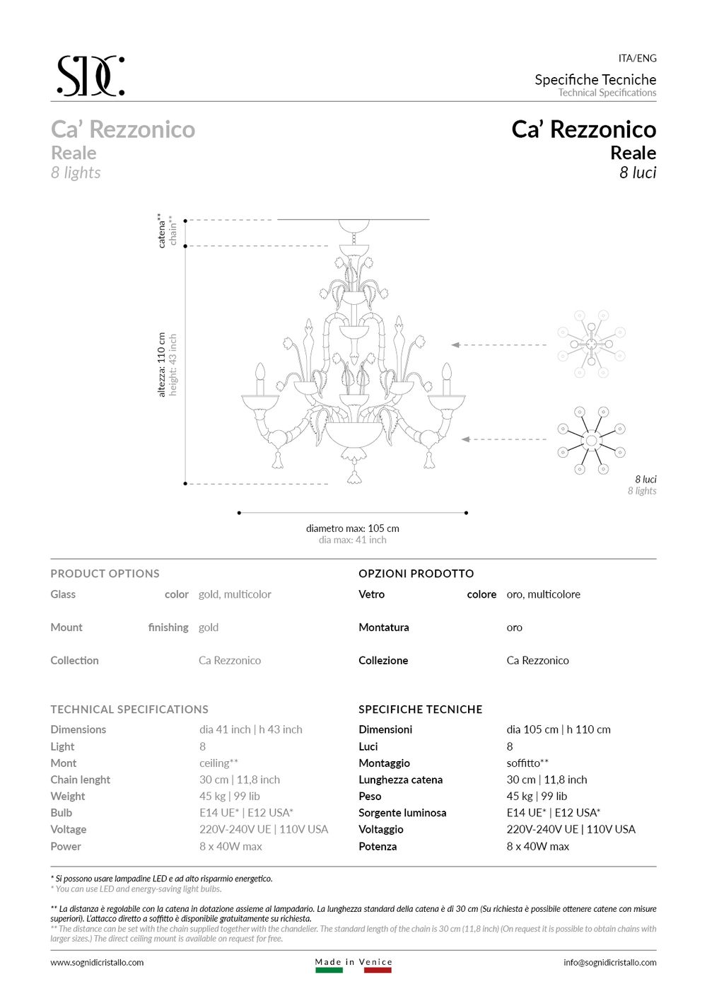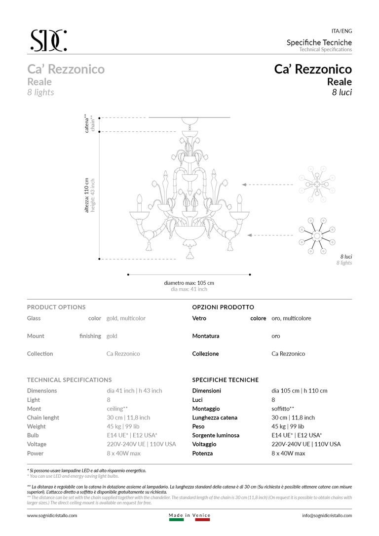 Ca' Rezzonico Reale: autentico lampadario in vetro soffiato veneziano Sogni di Cristallo®.