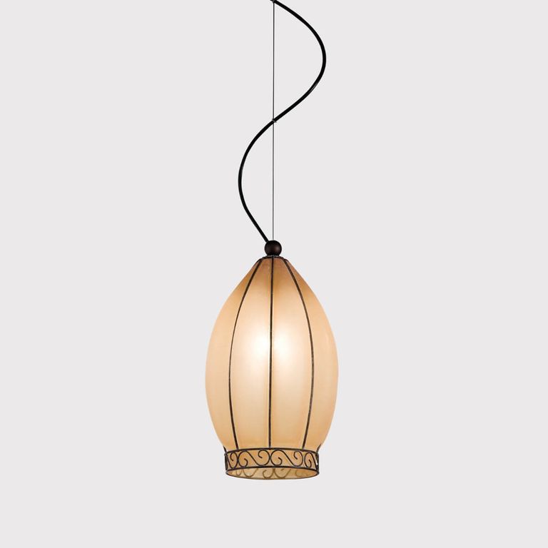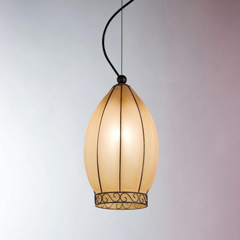 Lavorato con la tecnica della soffiatura del vetro all'interno di una gabbia in metallo prendendo la caratteristica forma.