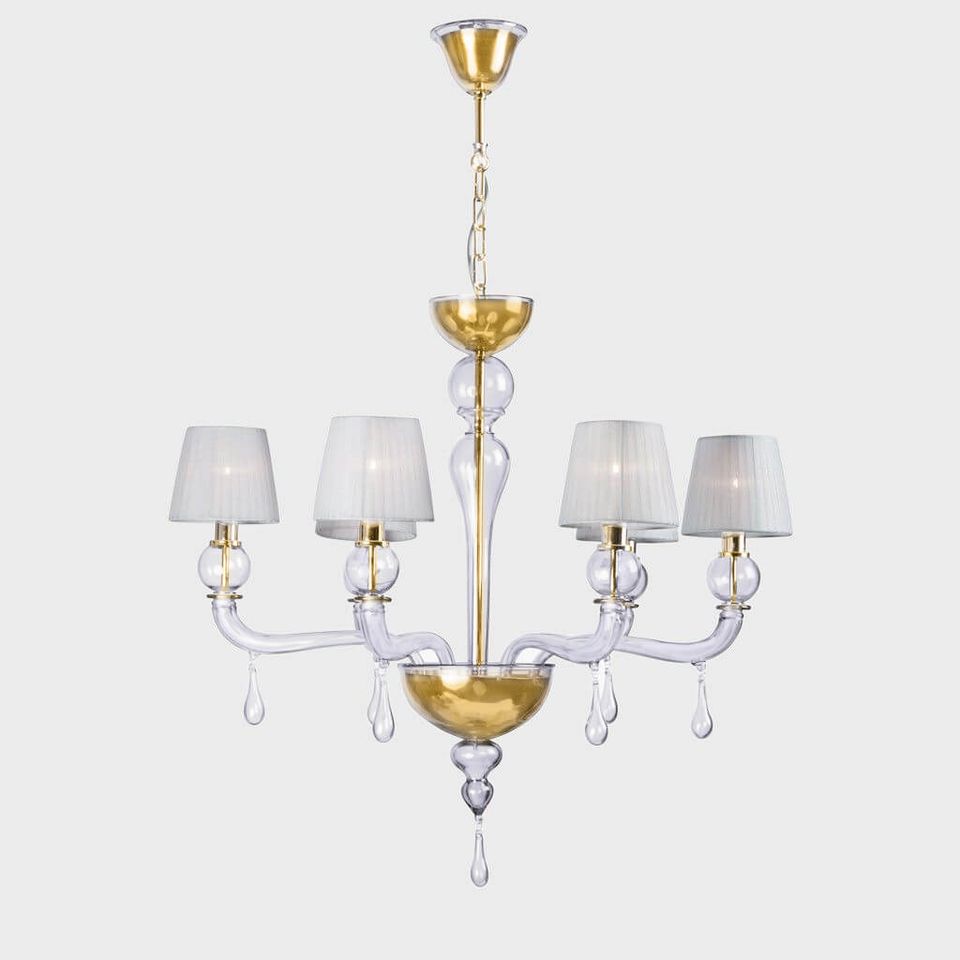 Un'opera d'arte caratterizzata da un ricercato disegno, gli eleganti paralumi e dalle particolari gocce in vetro lavorate esclusivamente a mano dai maestri muranesi.