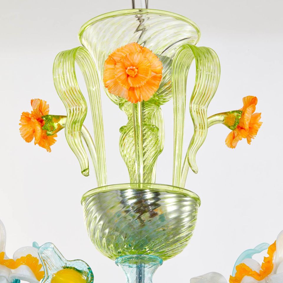 Elegante lavorazione in pasta vitrea colorata, arricchita da un trionfo di preziosi particolari in vetro, quali fiori e foglie, lavorati esclusivamente a mano dai maestri vetrai veneziani.