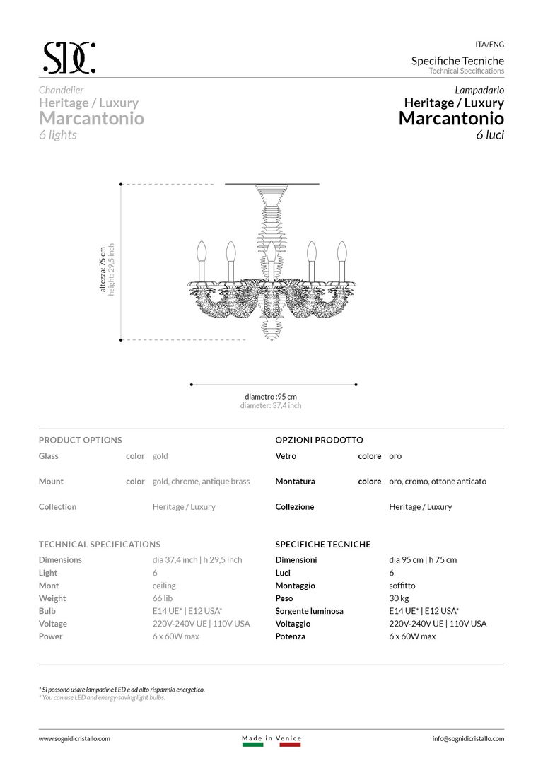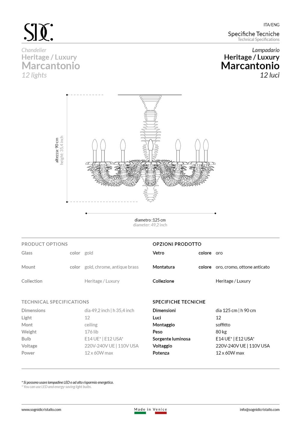 Marcantonio d'oro: autentico lampadario in vetro soffiato della collezione Heritage Sogni di Cristallo®.