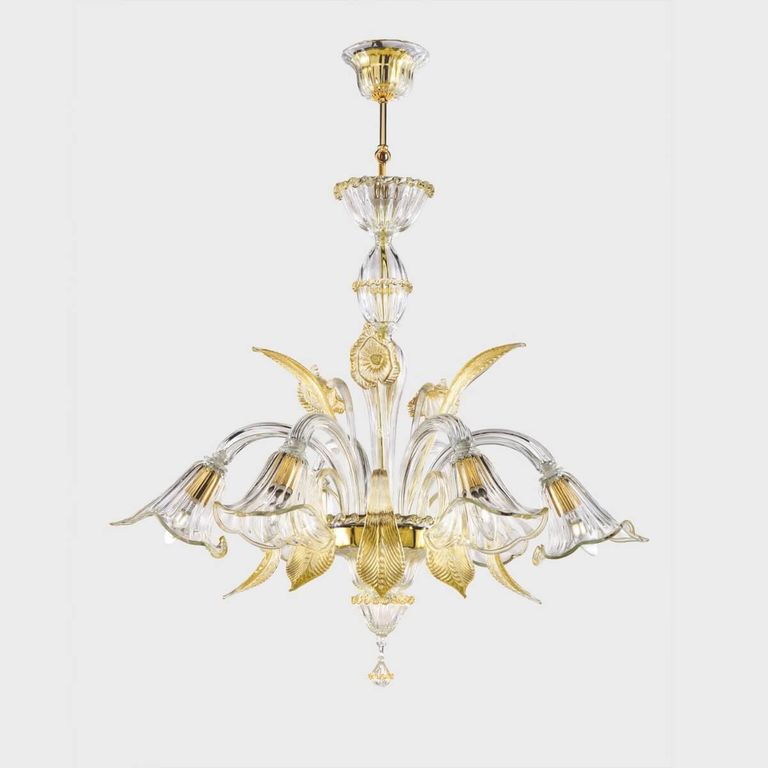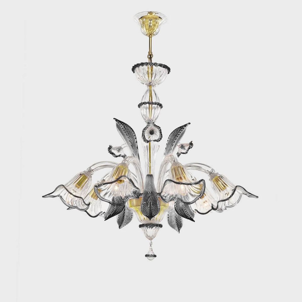 Work of art embellished with precious leaves and flowers produced by Venetian master glassmakers.