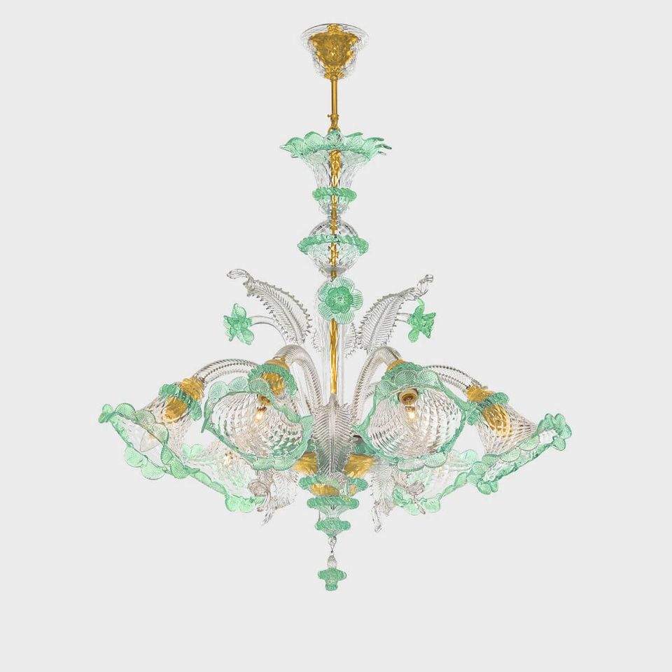 Work of art embellished with precious leaves and flowers produced by Venetian master glassmakers.