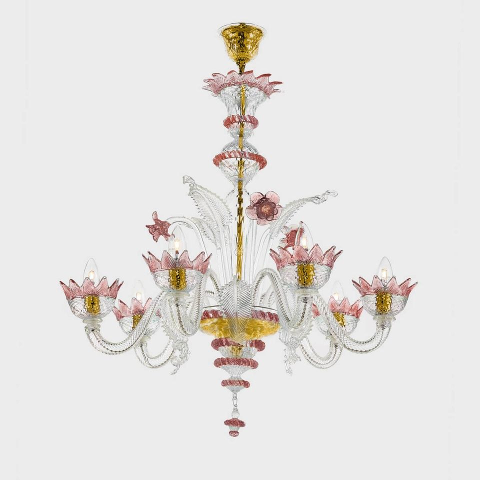 Work of art embellished with precious leaves and flowers produced by Venetian master glassmakers.