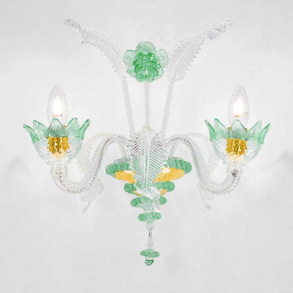 • Work of art embellished with precious leaves and flowers produced by Venetian master glassmakers.
