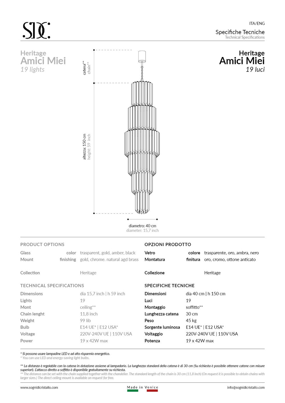 • Amici miei – Lampara de techo: auténtica lámparas de araña de de la colección heritage de vidrio soplado veneciano Sogni di Cristallo®.