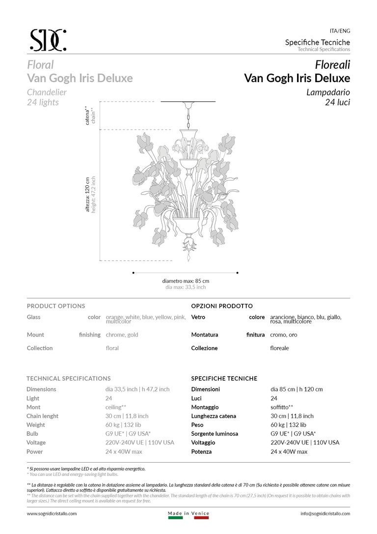 • Un travail élégant en pâte de verre colorée, enrichi d’une explosion de détails précieux, surtout ceux qui sont faits en verre, comme les fleurs et les feuilles, exclusivement réalisées à la main par les maîtres verriers vénitiens.
