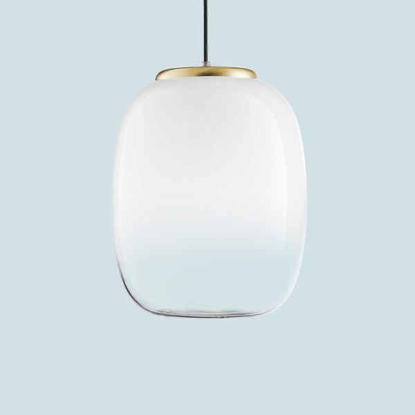 Lámpara en suspensión de vidrio soplado con difusor de luz inspirada en el diseño de los años 80.