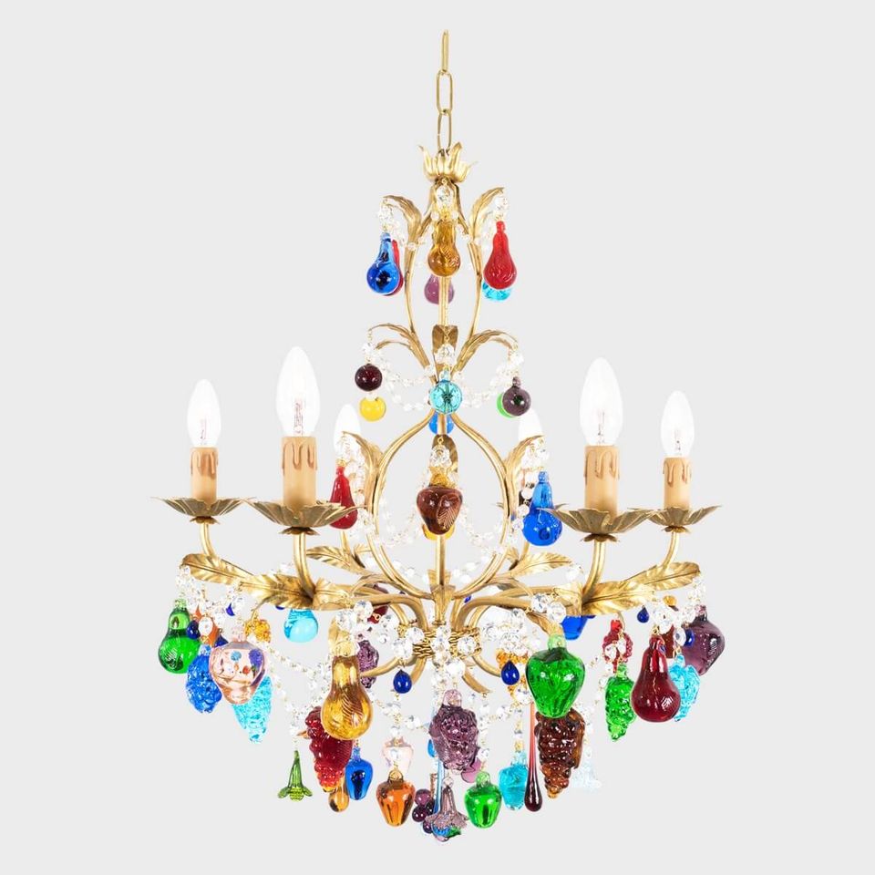 • The bright and colourful glass pendants are hand forged by Venetian master glassmakers while the shaft is in wrought iron with brushed gold leaf.